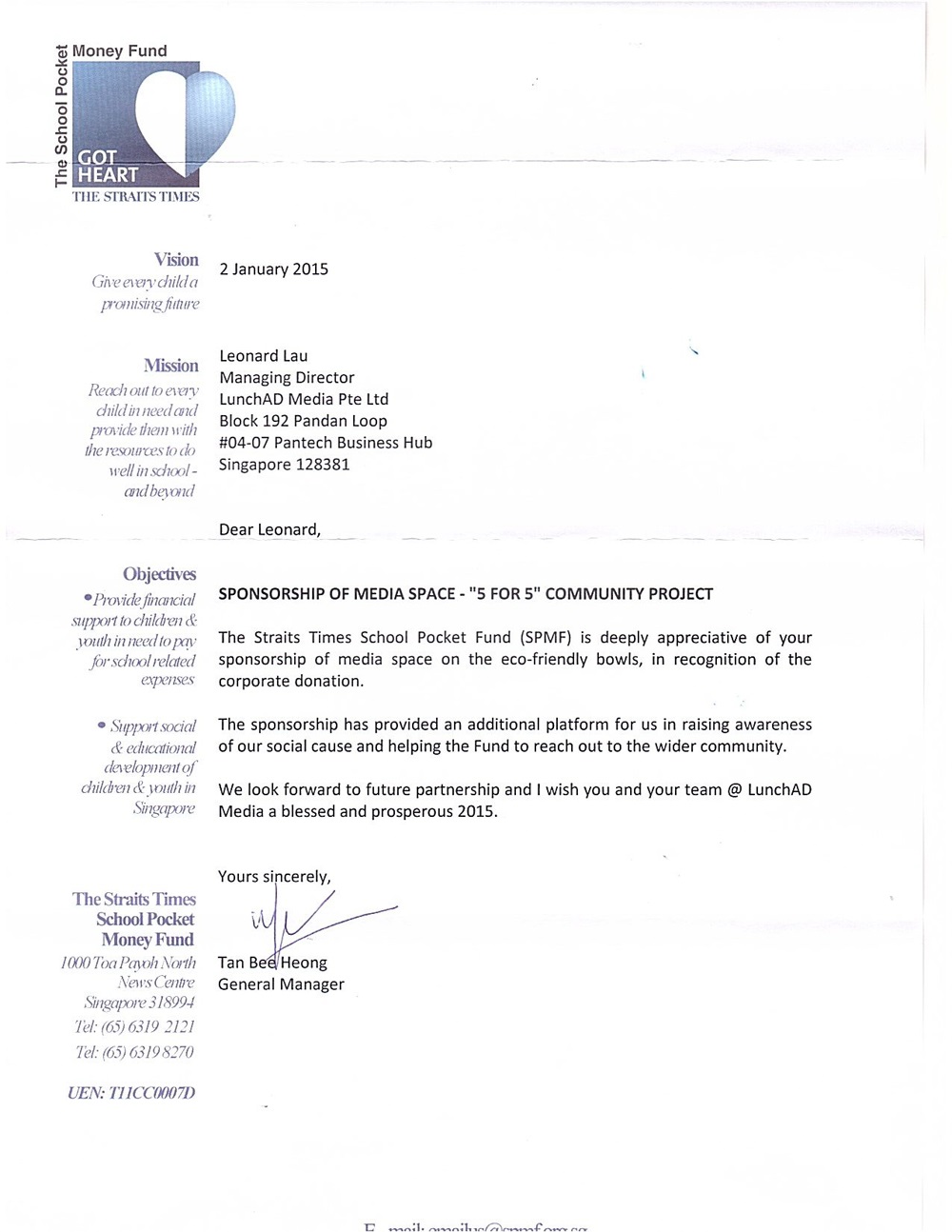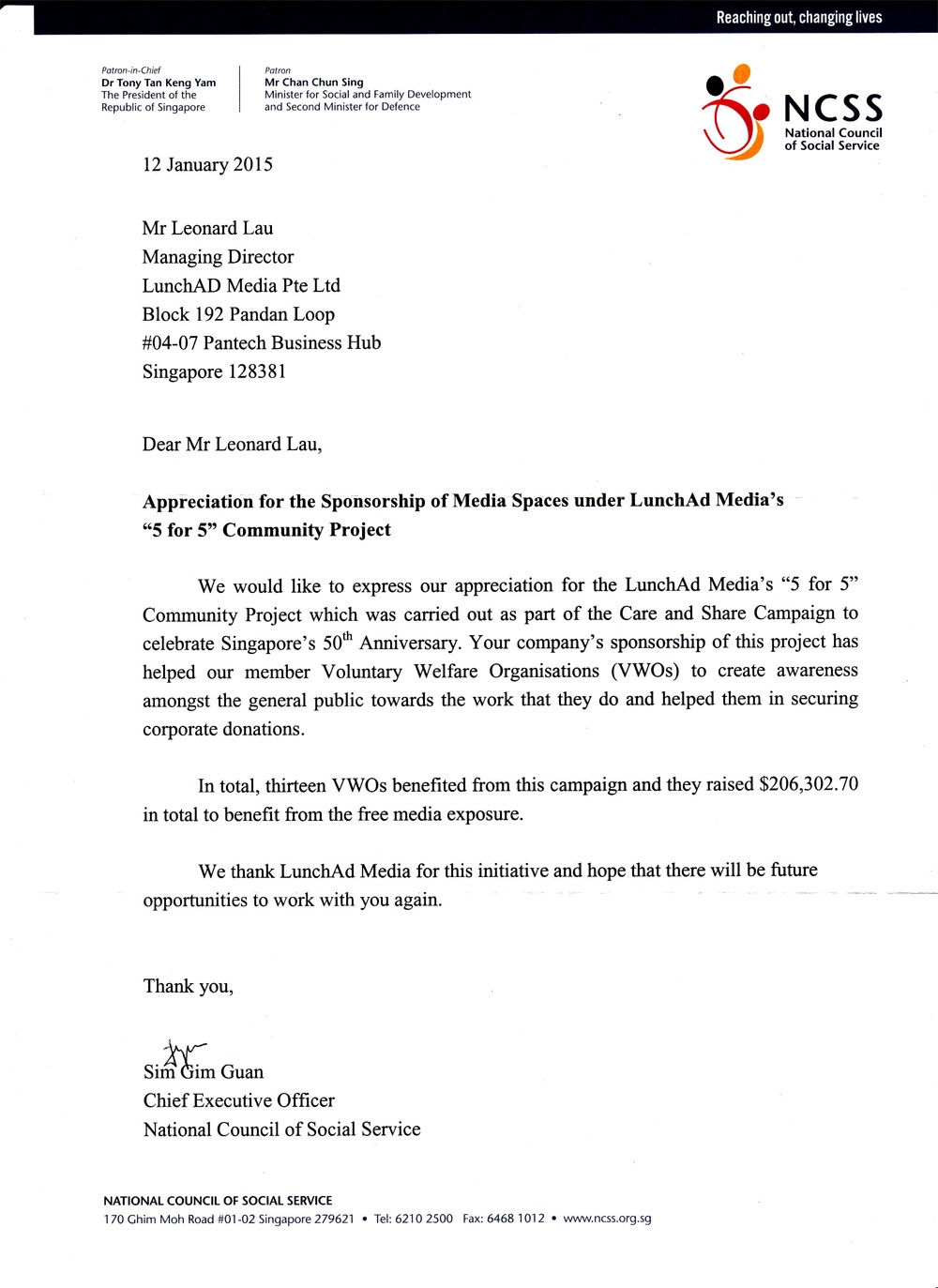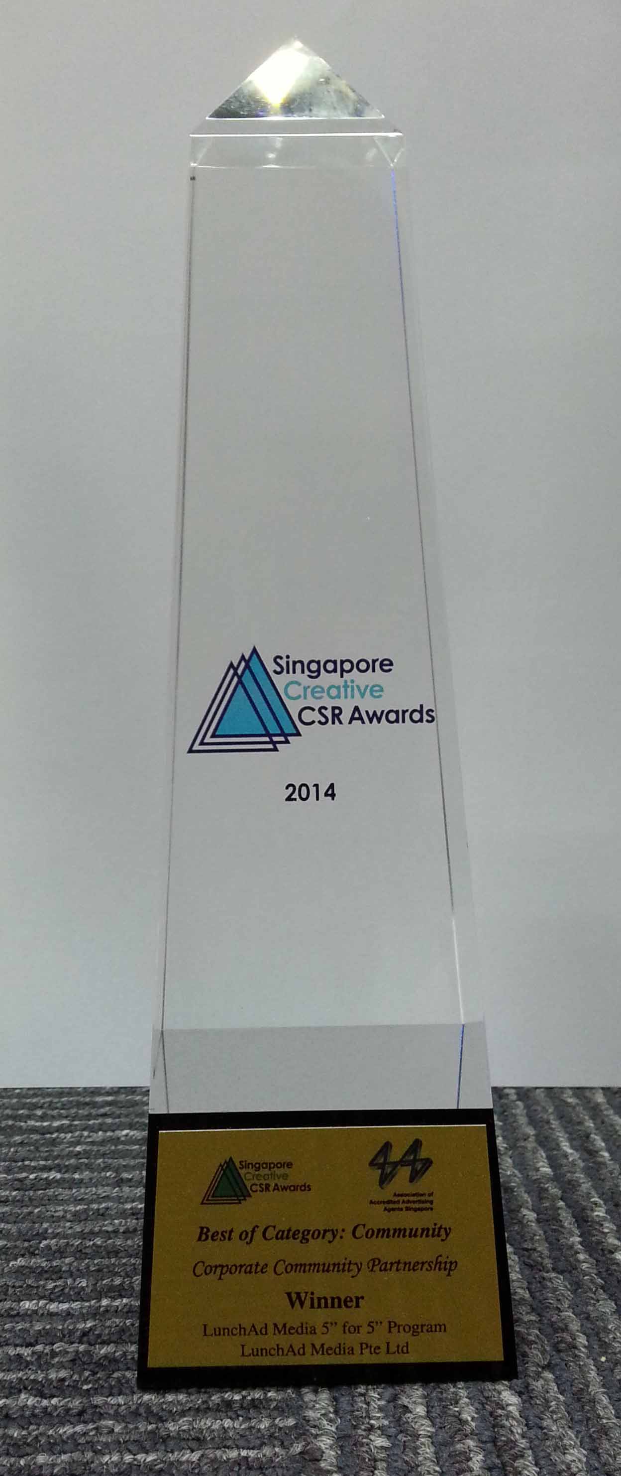 Congratulations to LunchAd Media on winning the Singapore Creative CSR Award 2014. The '5 for 5 initiative' has been an innovative platform in attracting businesses to participate in corporate giving.